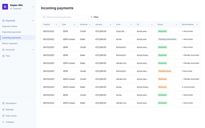 While all those payment workflows take place, multiple teams need to be able to access the latest status of payments for their own objectives. The Mambu Payments dashboard makes it easy to create transparency on a company payment flows.