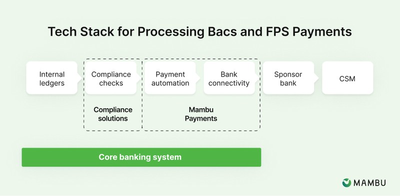 Processing Bacs and FPS payments as an indirect participant involves complex and strictly codified operations. Manually managing these workflows is not realistic. However, building the systems that automate them can be a daunting project. In this section, we break down the tech stack required to process Bacs and FPS payments as an indirect participant, and how solutions like Mambu Payments help.