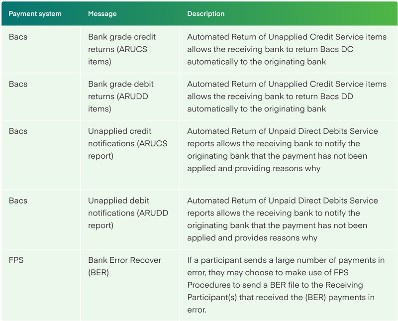 Bacs and FPS documentations specify and standardise how to handle these errors, and indirect participants must be able to send, receive, and process the messages related to these cases.
