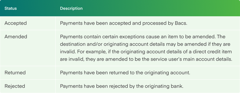 - After the payments have been processed by Bacs, receive the "credit contra" PSP to PSP message