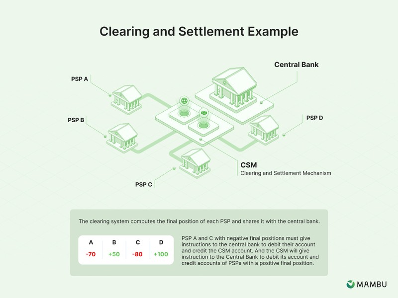 In the example above, we described the clearing process, which includes transmitting, reconciling and confirming transfer orders before settlement, the netting of orders and the establishment of final positions for settlement.