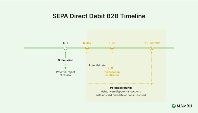 As a result of this extra step and the security implied for the debtor, a SEPA direct debit B2B payment cannot be refunded by the payer if there was a valid mandate and if the mandate had been authorised, unlike a SEPA direct debit core payment. A SDD B2B payment can still be refunded up to 13 months after execution if there was no valid mandate or if it was not authorised. The debtor’s PSP may still return the payment up to three days after the execution for technical reasons or because the debtor PSP is unable to accept the collection for other reasons, such as the account being closed, the customer being deceased, the account not accepting direct debit, or the debtor refusing the debit.