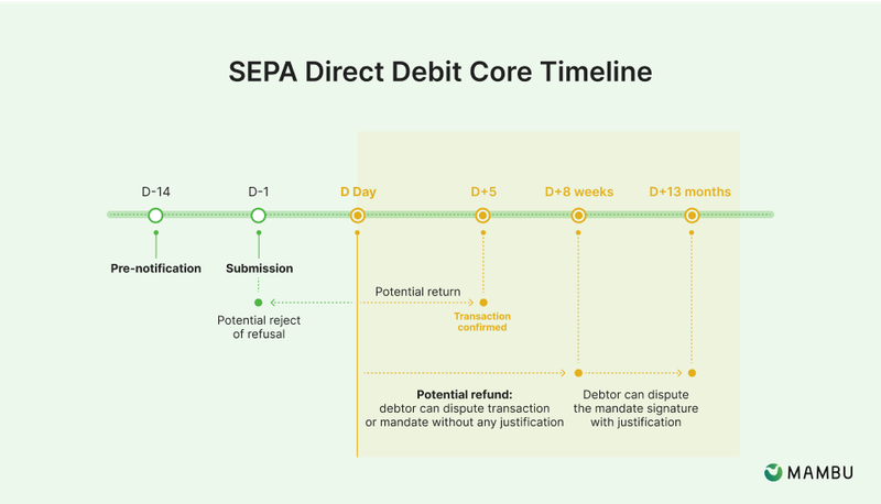 The payment must be initiated between two weeks and two business days before its due date. It can be rejected by the debtor’s bank until five days after its due date, for instance if the account has been closed. The debtor needs to be notified two weeks in advance of the settlement date unless the debtor explicitly waives the notification.