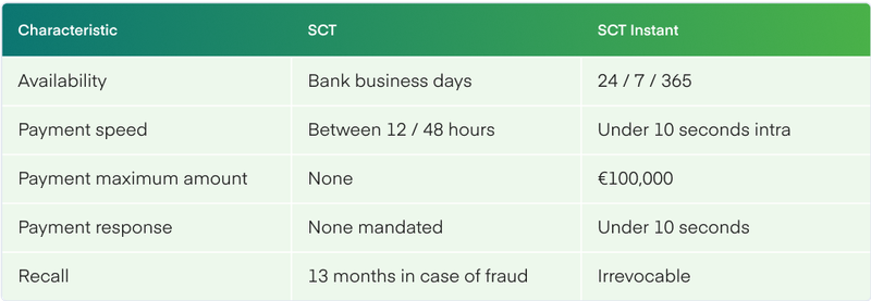 The table below summarises the key differences between SEPA Credit Transfer payments and SEPA Instant Credit Transfer payments.