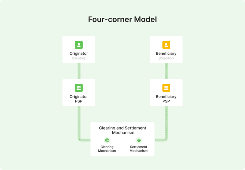 Similarly to traditional SEPA credit transfers, SEPA instant credit transfers rely on a four-corner model, based on one originator and its Payment Service Provider (in most cases a bank) and one beneficiary and its PSP. PSPs are not directly connected to each other, but are interconnected through a clearing and settlement mechanism (CSM) for the clearing and settlement of their payments.
