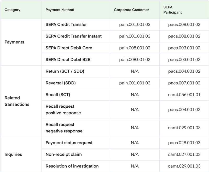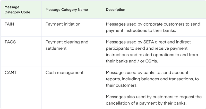 ISO 20022 is a standard for data exchange between financial institutions, and is the messaging standard used for SEPA payments. Both PSPs (payment service providers) and CSMs (clearing and settlement mechanisms) send payment data using ISO 20022.