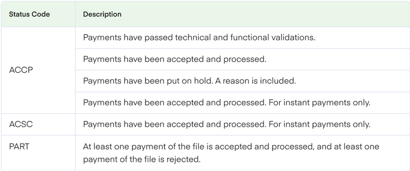 A payment status report (PSR) indicates if and how the payments contained in the payment file have been processed by the bank. Common processing statuses include: