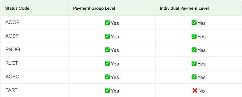 If all the payments of a PSR have the same status, then the whole group can be tagged with this status. Conversely, if the group contains payments that have different statuses, the group status will be PART and every payment details will contain the individual payment status. The following table summarises the different statuses payments can have and whether the status is at a payment group or individual payment level: