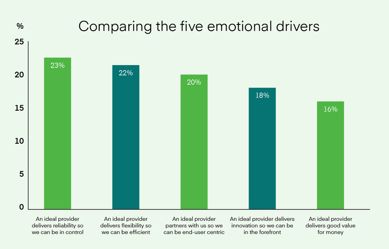 The top emotional drivers uncovered in our research — reliability, partnership, innovation, flexibility, and value — provide insight into the real-world criteria that decision-makers use to choose which provider they want to partner with to build, scale, and grow.