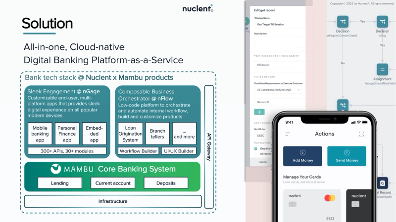 Nuclent x Mambu combination truly pushes composable banking concept from core banking to engagement layer and business process management layer. Nuclent is pre-integrated with Mambu. Client can now finally enjoy end to end banking in a box solution, all cloud natives and true SaaS. Launching your digital bank in record time without huge down payment. Enjoying configurability on every-steps, allowing lightning-fast, unlimited innovation.