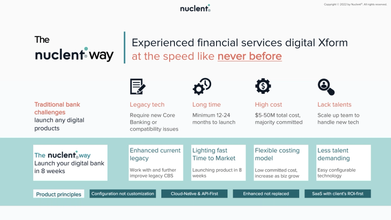 Nuclent revolutionises how banks, FIs and Fintech launch digital financial services - Making it faster, better, more affordable and allows true technology ownership. Working with Nuclent platforms makes your product differentiation strategy happens today and ensures unlimited innovation in the future.